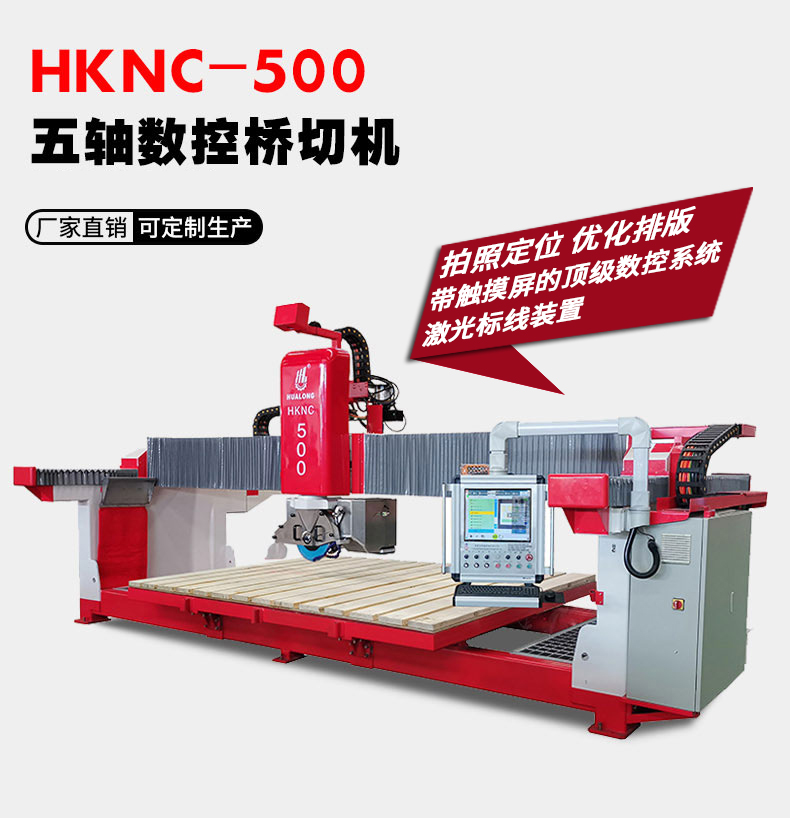 橋式石材切割機HKNC-500,配備意大利數(shù)控系統(tǒng)ESA和5軸插補,適用于切割各種尺寸的石板,如花崗巖、大理石、石英巖和人造石板等。它結(jié)合了雕刻的功能、銑、切、鉆、雕一體進行復(fù)雜臺面加工。