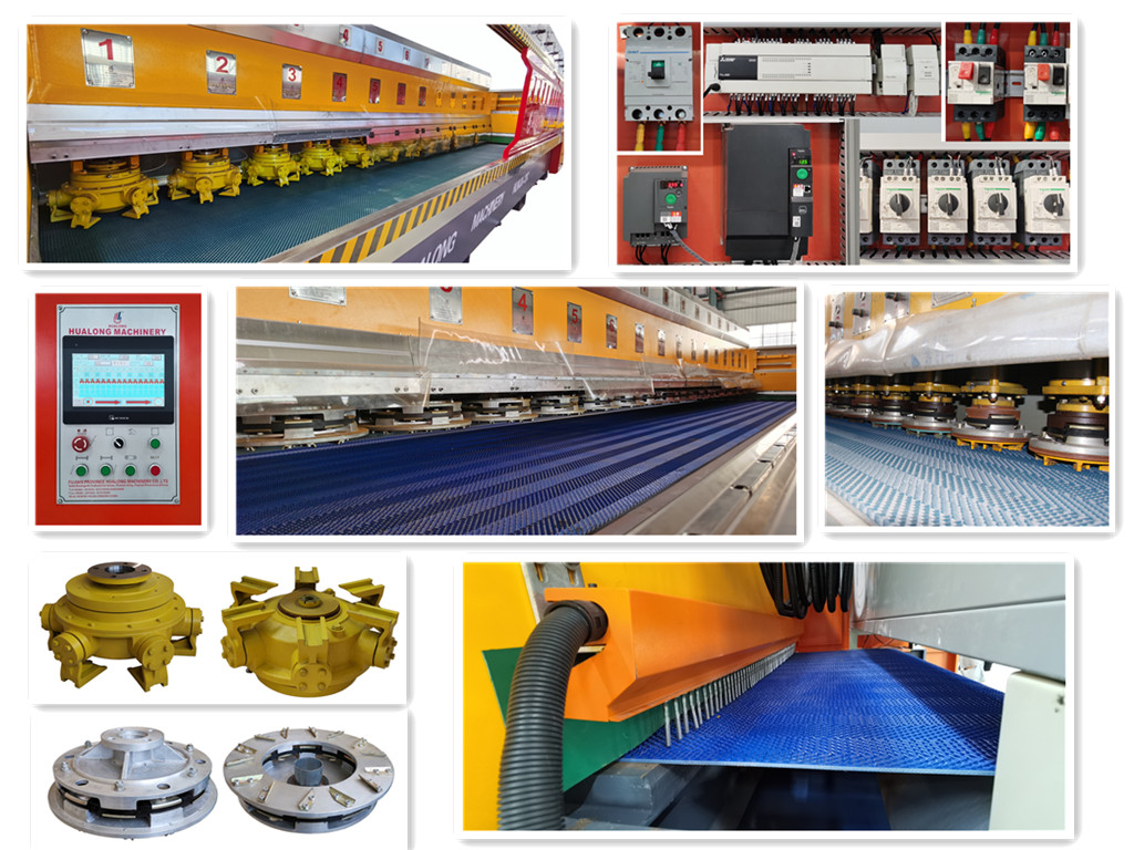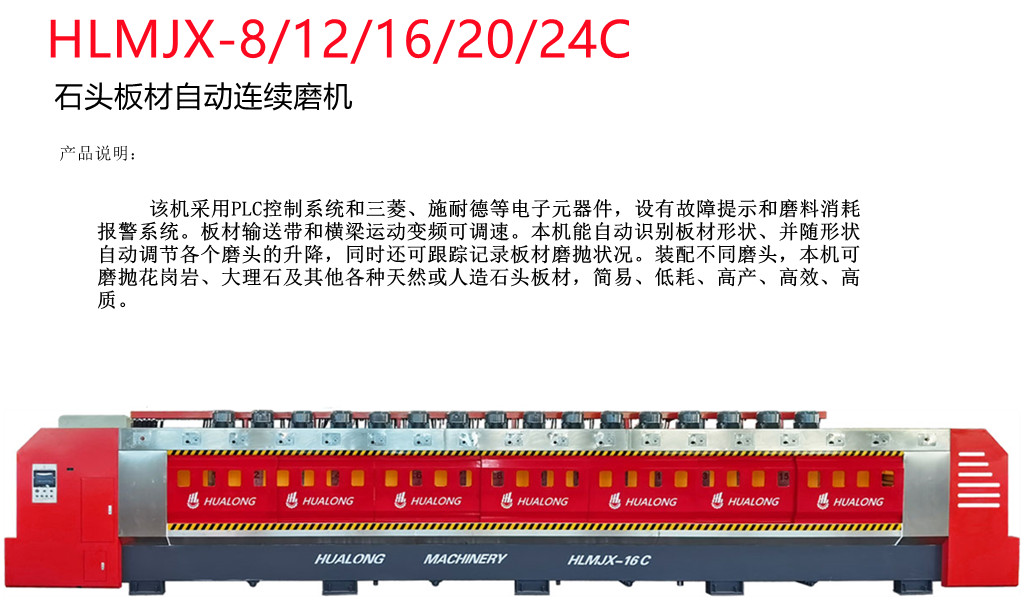 Main FeaturesHLMJX-16,equipped with multiple resin disc heads and PLC control system, can grind and plolish slabs continously and automatically, is perfect for surface finishing of hard stone such as granite. Mounted with different type of heads, it’s also great for marble, quartize and other stone slab finishing.